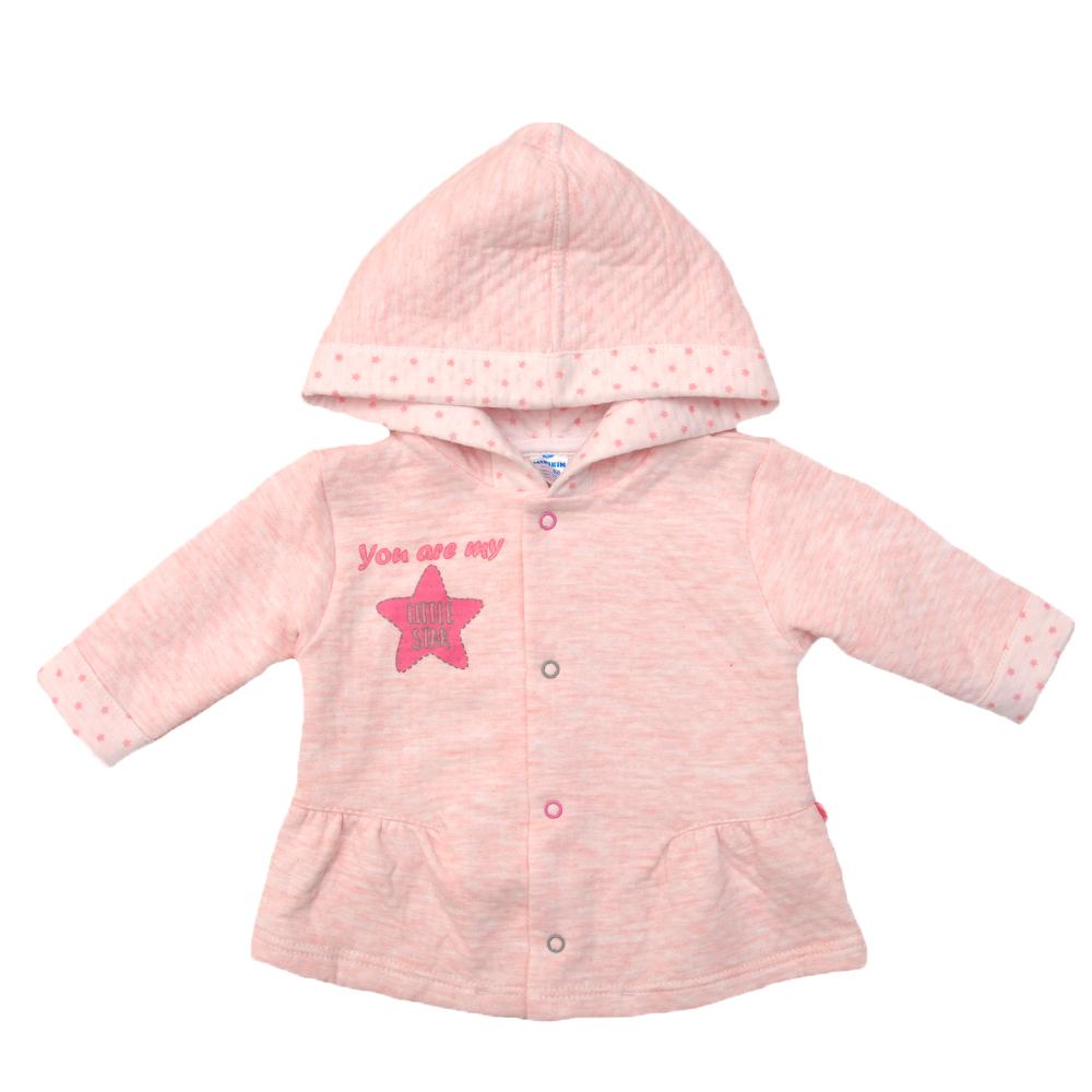 Stylish jacket with hood of «Little Star» series with print " Star", printing of which ink bezftalatnye were used gippoallergennye ;. On the right side of the breast is the inscription «You are my little star» and an asterisk, since for each mother her baby is a little star. By the bottom of the jacket expands and the sides it is decorated fees. Button on the product does not contain nickel quality Nikel Free), so will not cause allergies in your baby. The length of the jacket is enough to cover the child's back and you can be sure that not his testimonies Prodi. Jacket sewn from fabric Capiton quality (100% Cotton). It is dense enough quality called " sandwich " - kulira layer, then syntepon layer and another layer kulira ;, 41 & # excellently retains body heat and toddler thus good air permeability to the child's skin does not sweat. Model of this product is that syaditsya fine for a child of any body. In the jacket two colors: pink and milky.